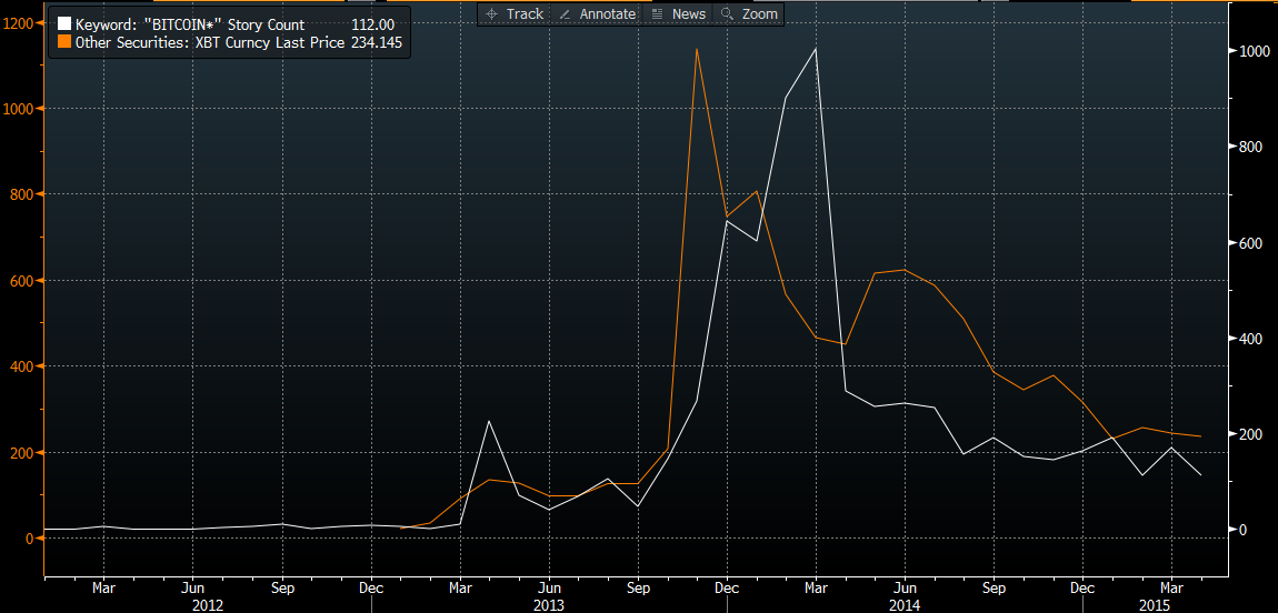 Le cours de la devise virtuelle semble à 100% correlé à l'intérêt médiatique pour celle ci. Comparaison entre le cours du Bitcoin et le nombre de mentions dans les medias.